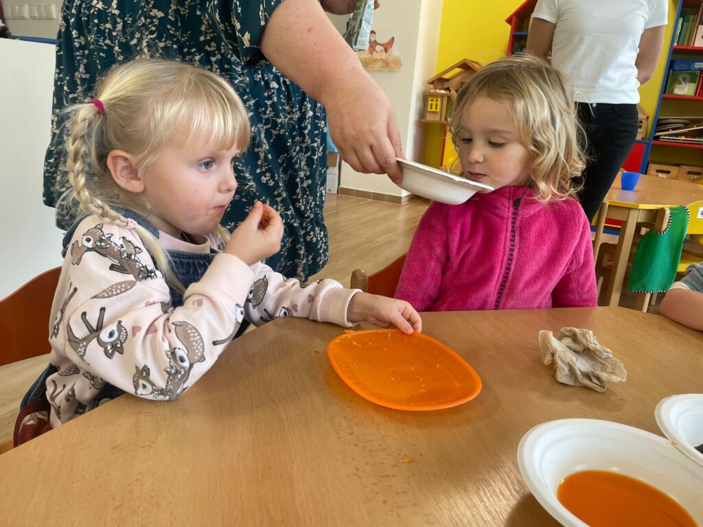 Se staršími dětmi jsme se vydali na návštěvu do MŠ Pampeliška na výukový program od společnosti AMPI „Zahrada na talíři“. Děti se seznámily s tím, jak se sází ovoce a zelenina. Děti si nastouhaly a ochutnaly mrkev, celer a jablko. Poté si každý namaloval talíř s polévkou. Místo temper však děti použily mrkev, řepu a koření. Moc jsme si to všichni užili 🙂